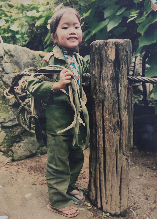 ワイヤーロープを支える柱の橫に立つ子供の頃の余燕恰さん(寫真提供?本人)。