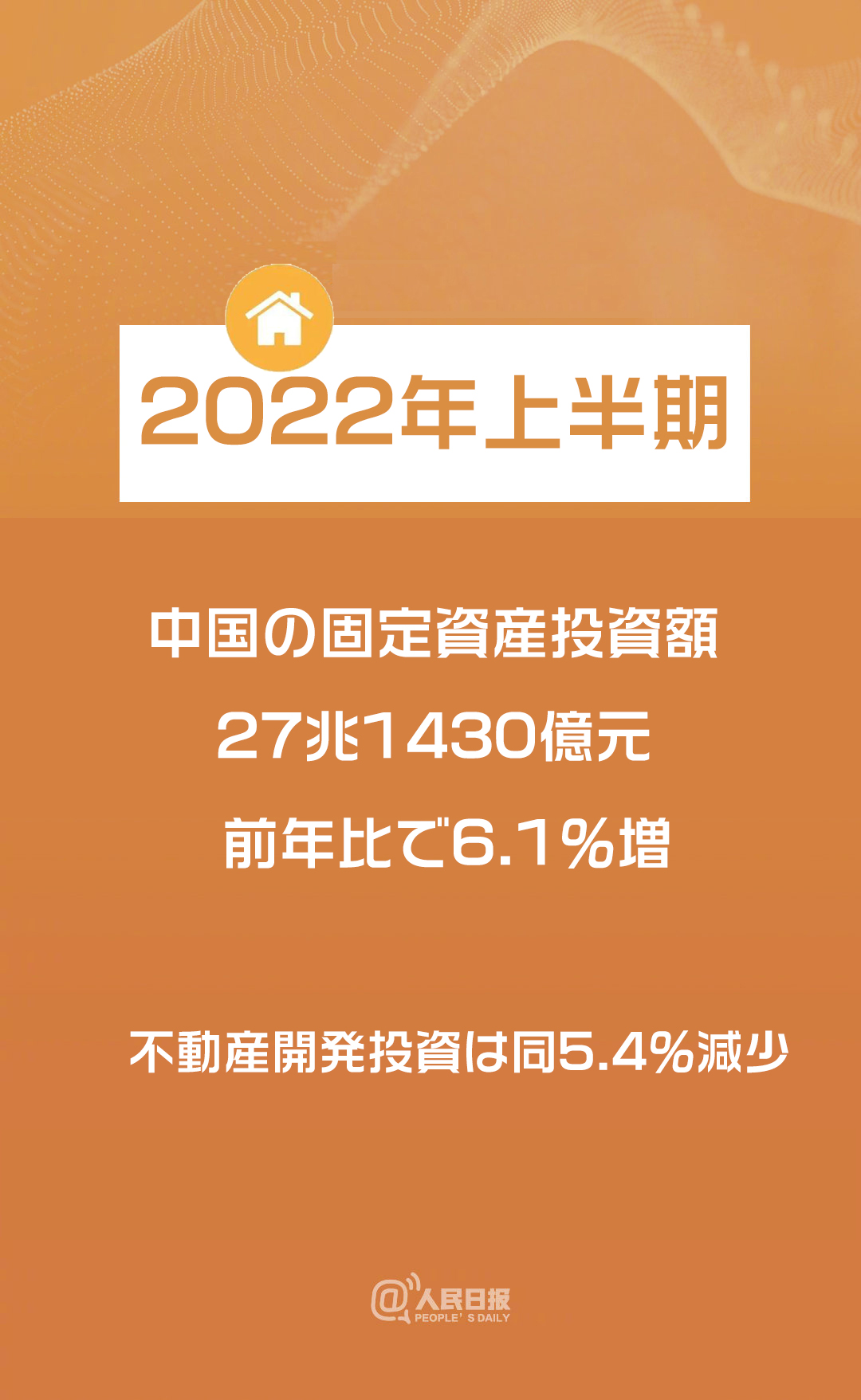 國(guó)家統(tǒng)計(jì)局が15日に発表したデータによると、今年上半期には全國(guó)の固定資産投資(農(nóng)家除く)が前年同期比6.1%増の27兆1430億元(1元は約20.6円)に上り、このうち不動(dòng)産開(kāi)発投資は同5.4%減少した。全國(guó)の分譲住宅販売面積は同22.2%減の6億8923萬(wàn)平方メートル。分譲住宅売上高は同28.9%減の6兆6072億元だった。(編集KS)