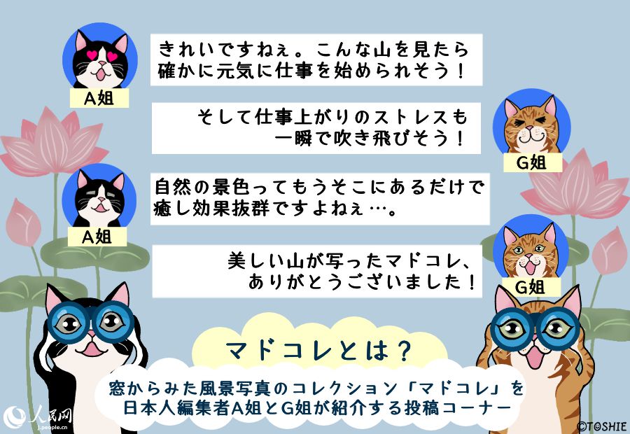 ウチのオフィスの窓からは、こんな風(fēng)景またはこんなモノが見えると自慢していただく「マドコレ(窓から見た風(fēng)景コレクション)」コーナー。どこまでも続く青い空や遠くに見える山々といった自然の風(fēng)景から、オフィス街に建ち並ぶ高層ビルや幹線道路を走る車、庶民の暮らしが垣間見えるローカルな街並み、はたまた移動中の車窓からの眺めなどなど、高さや場所も異なれば、その窓から眺める風(fēng)景も千差萬別。中には仕事の意欲をアップさせてくれる元気の出る光景もあれば、疲れを癒してくれるほっこりした風(fēng)景も。そんな皆さまからお寄せいただいたマドコレの數(shù)々を、毎週火曜日に、人民網(wǎng)日本人編集者のA姐とG姐がコメントしながら、のんびり紹介していきます。