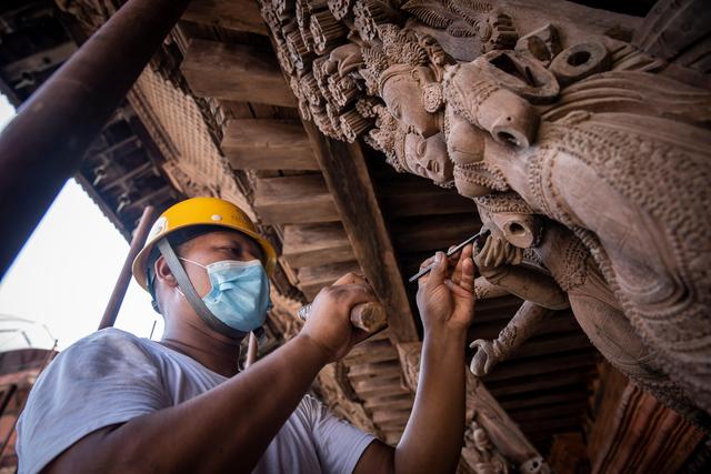 修復(fù)作業(yè)チームのチーフエンジニア?周建國(guó)氏は、「歴史資料に限りがあるため、倒壊した部分を修復(fù)するのは困難を極めた。経験ある職人を訪(fǎng)ねたり、古い寫(xiě)真を収集したりして、できる限り建築群を元通りの姿に修復(fù)した。またバサンタプルタワーには大量の精巧な木製の構(gòu)成要素がある。修復(fù)プロジェクトでは、全體の約15%に當(dāng)たる3700點(diǎn)以上の彫刻の構(gòu)成要素を新たに作り直し、元々の構(gòu)成要素の利用率は85%に達(dá)した」と説明する。