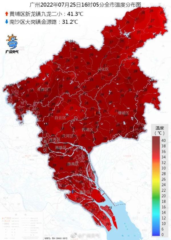 今月25日午後1時(shí)25分の時(shí)點(diǎn)で、広東省の144ヶ所ですでに高溫警報(bào)が発令されており、うち31ヶ所が3段階で最も深刻なレベルの赤色警報(bào)となっていて、主に広州や仏山、同省東部、北部に集中している。広州市黃埔區(qū)新竜鎮(zhèn)の九竜第二小學(xué)校では、気溫41.3度も記録した。