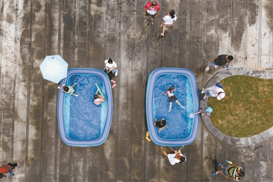 猛暑となり、大人気となっているプールやウォーターアトラクション(撮影?楊耀燁)。