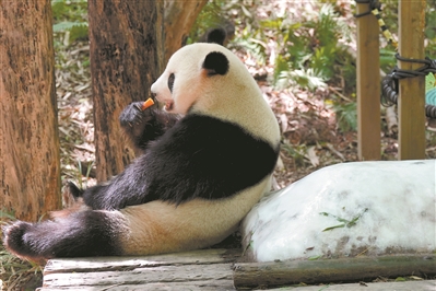 暑さ対策の特製アイスを食べる動(dòng)物園のパンダ(撮影?王維宣)。