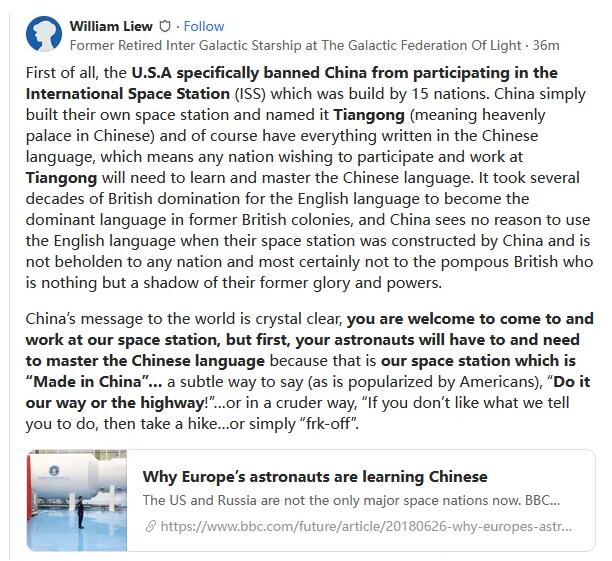実験モジュール「問天」を搭載した中國の「長征5號B遙」キャリアロケットが成功裏に打ち上げられ、中國內(nèi)外のメディア及びネットユーザーのホットな話題になった?!窺uora」で1年前に投稿された「中國の宇宙ステーションは中國語しか使用しないが、これは中國が非常に閉鎖的で、『世界で通用しない言語』により他國の科學(xué)者を排斥しようとしているのだろうか」という疑問が、再び熱く議論されるようになった。