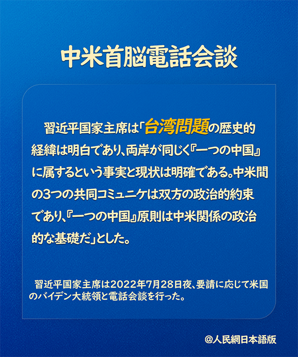習(xí)主席は、臺灣問題における中國の原則的立場を重點的に表明し、「臺灣問題の歴史的経緯は明白であり、両岸が同じく『一つの中國』に屬するという事実と現(xiàn)狀は明確である。中米間の3つの共同コミュニケは雙方の政治的約束であり、『一つの中國』原則は中米関係の政治的な基礎(chǔ)だ。我々は『臺灣獨立』と外部勢力による干渉に斷固反対し、いかなる形の『臺灣獨立』に対しても、いかなる余地も斷じて殘さない。臺灣問題における中國の政府と國民の立場は終始一貫しており、中國の國家主権と領(lǐng)土的一體性を斷固として守ることは中國國民14億人余りの斷固たる意志だ。米側(cè)は言動を一致させて『一つの中國』原則を厳守し、中米間の3つの共同コミュニケを履行すべきである」と強調(diào)した。