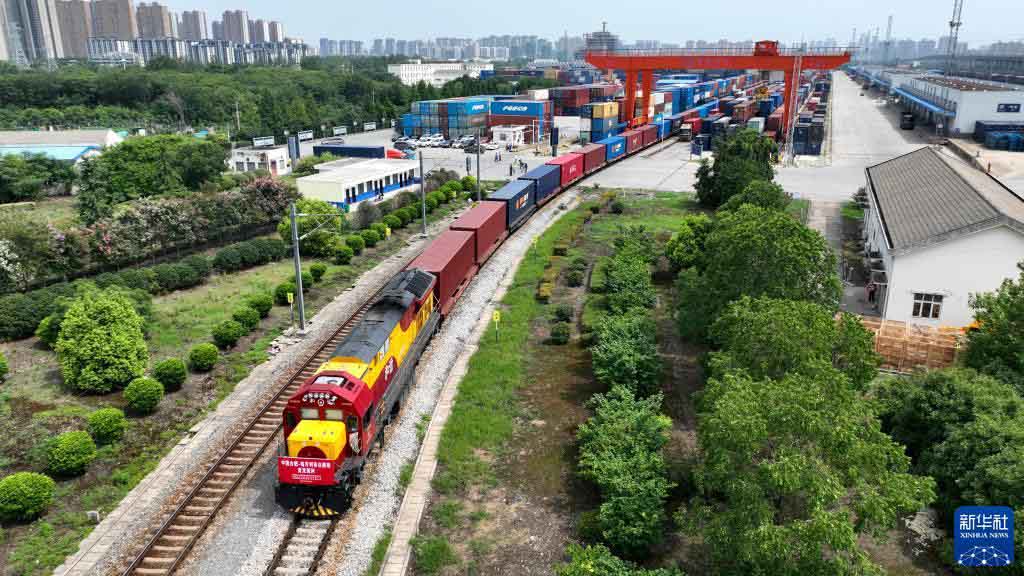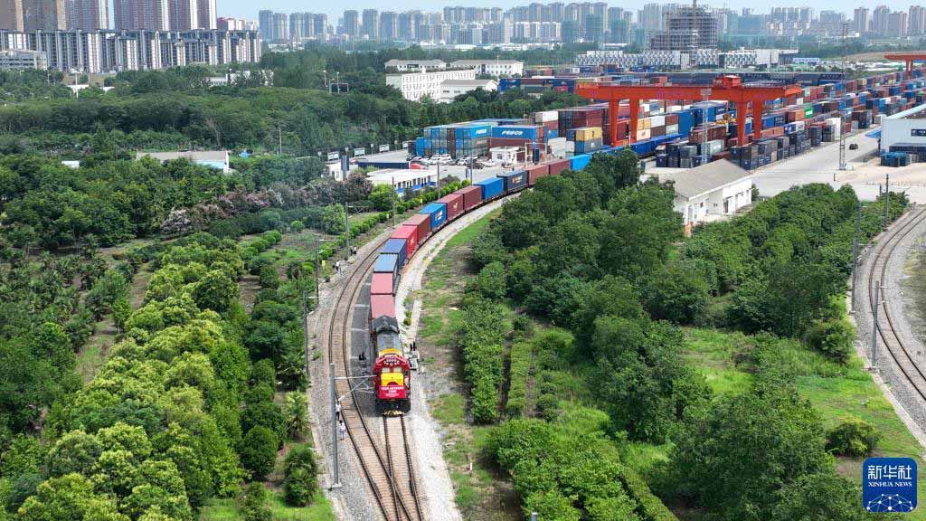 7月29日、安徽省の合肥北駅?物流拠點(diǎn)からハンガリー?ブダペストに向かって出発する「中歐班列」(ドローンで撮影)。