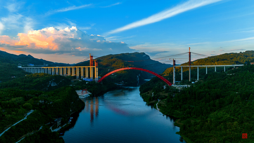 貴州省徳江県と余慶県をむすぶ徳余高速道路烏江特大橋のメインアーチが15日、正式に閉合した。