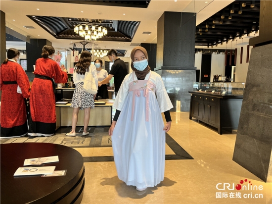 ロシア人の謝奕舒さん(中國(guó)語(yǔ)名)は、漢服を著て「とても素?cái)场工却笙菠婴?、ステップを踏んで中?guó)の踴りを踴り出した。