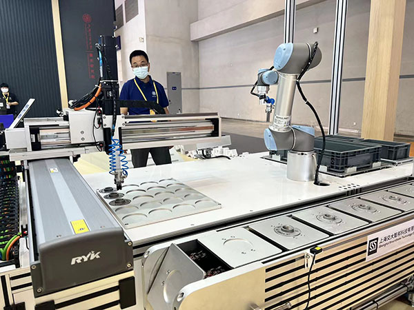 協(xié)働ロボットスマート化分別?材料注入システムを展示する上海交通大學重慶研究院の関係者。
