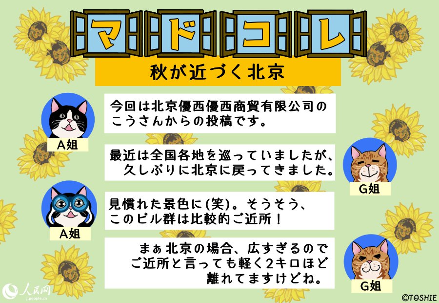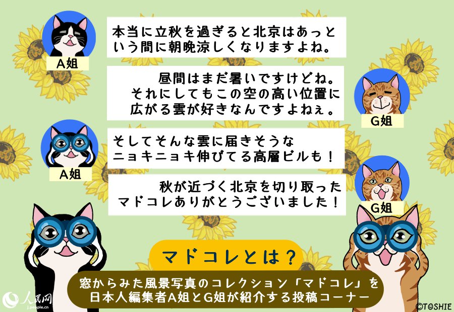 ウチのオフィスの窓からは、こんな風(fēng)景またはこんなモノが見(jiàn)えると自慢していただく「マドコレ(窓から見(jiàn)た風(fēng)景コレクション)」コーナー。どこまでも続く青い空や遠(yuǎn)くに見(jiàn)える山々といった自然の風(fēng)景から、オフィス街に建ち並ぶ高層ビルや幹線道路を走る車(chē)、庶民の暮らしが垣間見(jiàn)えるローカルな街並み、はたまた移動(dòng)中の車(chē)窓からの眺めなどなど、高さや場(chǎng)所も異なれば、その窓から眺める風(fēng)景も千差萬(wàn)別。中には仕事の意欲をアップさせてくれる元?dú)荬纬訾牍饩挨猡ⅳ欷?、疲れを癒してくれるほっこりした風(fēng)景も。そんな皆さまからお寄せいただいたマドコレの數(shù)々を、毎週火曜日に、人民網(wǎng)日本人編集者のA姐とG姐がコメントしながら、のんびり紹介していきます。