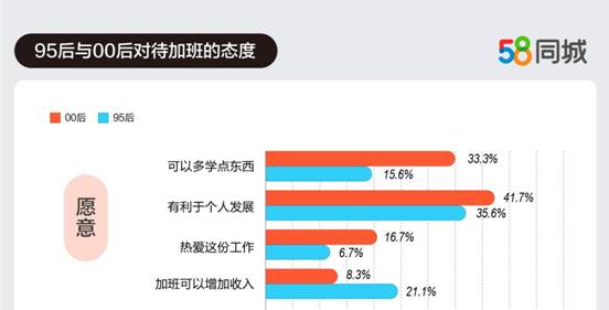 注目されるのは、「職場のルールを変えてしまう」というレッテルを貼られがちな「00後(2000年代生まれ)」が、実は社內(nèi)での競爭にさらされているということだ。58同城のデータによると、Z世代で他地域から北京に來て働く人の間では、週末に休日出勤をするのが一般的になっている割合は69.6%に達(dá)し、週末に1日休日出勤をする人の割合は60.8%に達(dá)する?!?0後」で1日休日出勤をする人の割合は「95後(1995年から1999年生まれ)」よりも高い75%だった。うち41.7%は「殘業(yè)?休日出勤は自分のキャリアアップにプラスになる」と考え、33.3%は「殘業(yè)?休日出勤で多くの事を?qū)Wべる」と考える。一方で「95後」は35.6%が「キャリアップにプラス」とし、21.1%が「収入を増やせる」としている。こうした數(shù)字から、「95後」は「00後」よりも個(gè)人のキャリアアップと経済的なプラス面を重視していることがわかる。