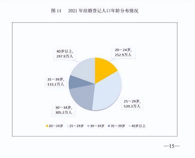 2021年に婚姻屆を出した男女の年齢を見ると、25-29歳が最多で539萬3000人。以下、30-34歳(305萬2000人)、40歳以上(297萬9000人)、20-24歳(252萬9000人)、35-39歳(133萬2000人)と続いた。(編集KN)