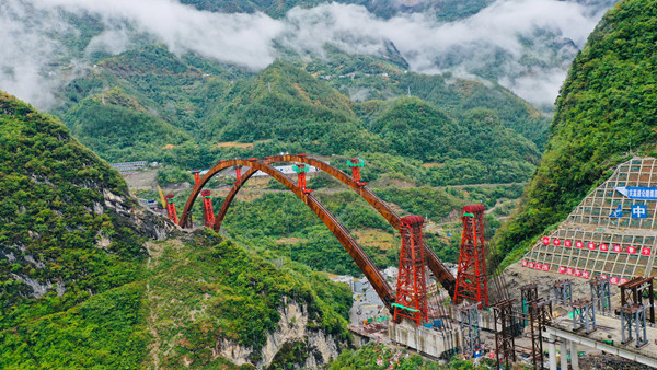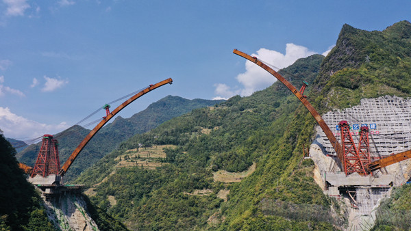 大巴山の奧に位置する城開高速道路蓼子特大橋は、典型的な山岳?丘陵地帯の橋だ。橋の全長は約330.8メートル。橋全體は4本のアーチリブを持ち、1本の重さは700トン、1つの回転體ユニットの重さは4700トンに達し、100メートルの高空で連続回転すると「空中バレエ」のようになる。