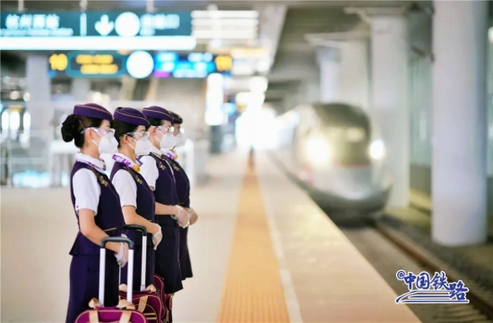 高速列車「復(fù)興號(hào)」が、パープルの制服を著た乗務(wù)員4人が待つプラットフォームにゆっくりと入り、列車発著をシミュレーションするテストがこのほど始まった。