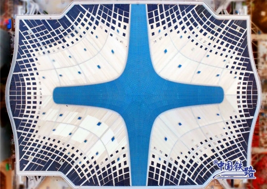 上空から見(jiàn)ると、この迫力満點(diǎn)の特大鉄道旅客駅は、大きな雲(yún)のように見(jiàn)える。巨大な建物は白を基調(diào)とし、水色の天窓は巨大な星のように光って見(jiàn)える。