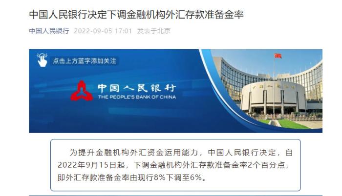 中國(guó)人民銀行(中央銀行)は5日、金融機(jī)関の外貨資金の運(yùn)用能力を高めるため、2022年9月15日から、金融機(jī)関の外貨預(yù)金準(zhǔn)備率を2ポイント引き下げ、現(xiàn)行の8%から6%に引き下げることを明らかにした。