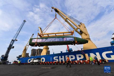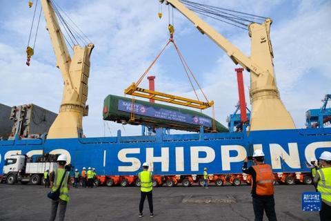 9月2日、インドネシア?ジャカルタのタンジュンプリオク港で開催された到著セレモニーで、船から降ろされるジャカルタ-バンドン高速鉄道の車両(撮影?徐欽)