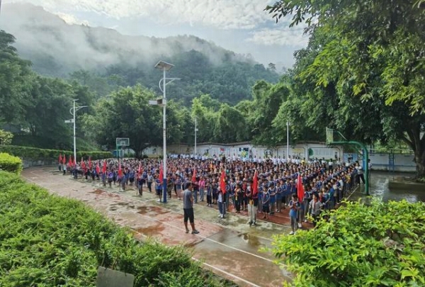 今月1日早朝、雲(yún)南省紅河哈尼(ハニ)族彝(イ)族自治州屏辺苗(ミャオ)族自治県灣塘郷にある灣塘小學(xué)校では、教師や児童が運(yùn)動(dòng)場(chǎng)の掃除をしていた。夜に大雨が降り、校內(nèi)にはガジュマルの葉がたくさん落ち、山の木の上には靄がかかり、雲(yún)の間からはやわらかな心地良い太陽の光が差し込んでいた。