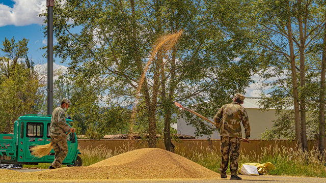 麥を高く放り投げて麥の粒と麥わらなどを分ける「揚(yáng)麥」の作業(yè)(撮影?馬翔)