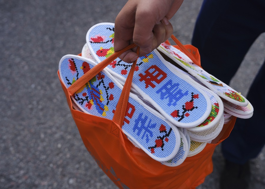 現(xiàn)地の住民が救援チームにプレゼントした手作りの靴の中敷き(撮影?程雪力)。