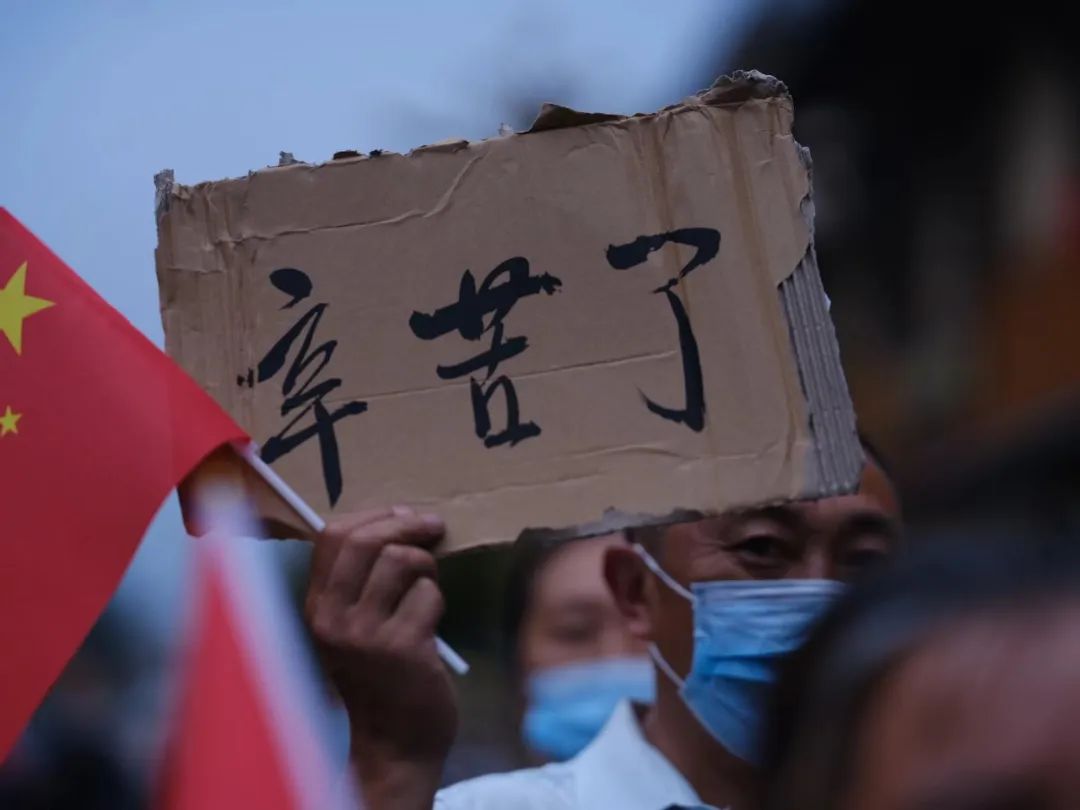 感謝の言葉を書いたプラカードを掲げて救援チームを見送る現(xiàn)地の人々(撮影?程雪力)。