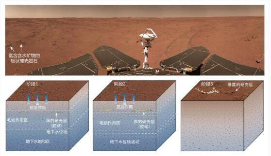 祝融號(hào)が著陸エリアで発見した、水を豊富に含む鉱物の板狀硬巖、及びその地下水の作用による形成プロセス。