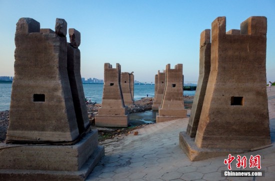 水位が下がり露出した桟橋のコンクリートの柱(撮影?張暢)。