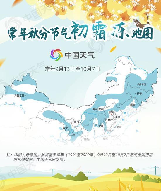 夜間の気溫が0度以下になると、冷やされた大気中の水蒸気が植物などの表面に昇華して霜となる?!盖锓帧工雾暏摔胜毪?、気溫が下がり、北方エリアの初霜の範(fàn)囲が急速に拡大する。これまでの「初霜マップ」を見ると、黒竜江省や吉林省、新疆維吾爾(ウイグル)自治區(qū)北部、內(nèi)蒙古(內(nèi)モンゴル)北東部、華北北部、東北中?北部、及び寧夏回族自治區(qū)、青海省東部一帯の標(biāo)高の高い地域で、「秋分」期間中に初霜が降りる。10月に入ると、初霜の範(fàn)囲が南下し、北京、天津、河北省といった地域でも初霜が観測(cè)されるようになる。そして、10月下旬になると、「初霜」ラインは淮河流域から秦嶺山脈一帯まで伸びる。
