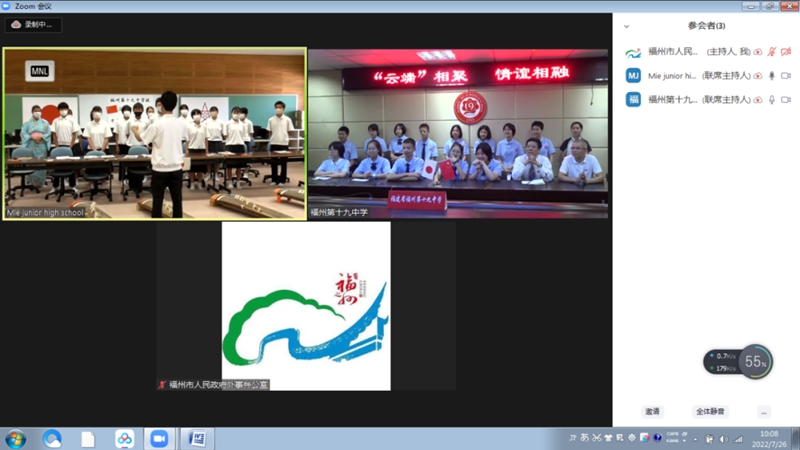 7月26日、福建省の福州市人民政府外事弁公室の支援を受けて、福州第十九中學とその友好校である日本長崎県の長崎市立三重中學校が青少年オンライン交流イベントを開催した。