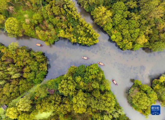 10月5日、江蘇省泰州市姜堰區(qū)の溱湖國家濕地公園で観光客が乗った遊覧船。(ドローンで撮影)