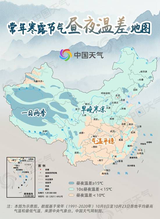 中國(guó)天気網(wǎng)の気象ビッグデータのまとめによると、「寒露」の期間中、中國(guó)では秋から冬へと移行する地域が一気に広がり、冬が秋を超越するようになる。また、中國(guó)の北方エリアのほとんどの地域では日中と夜間の気溫差が10度以上になり、華北エリアや西南エリアでも霧の発生しやすい時(shí)期へと突入する。