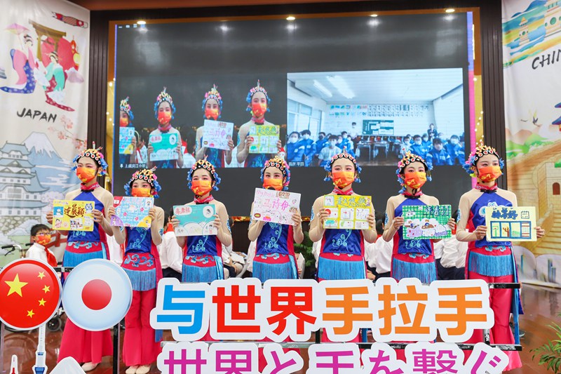 パフォーマンスのコーナーでは、上虞區(qū)浜江小學(xué)校がダンス「京韻」を披露し、中國の素晴らしい文化を紹介した。その後、中日の子供たちは教員の指導(dǎo)の下で、中國語と日本語を互いに勉強(qiáng)した。雙方は遠(yuǎn)く離れていたが、言語を通じ心を通わせ、互いに親しくなった。イベントの最後に、両校の6年生がアジア競技大會(huì)のテーマ曲「心心相融」を畫面越しに合唱した。