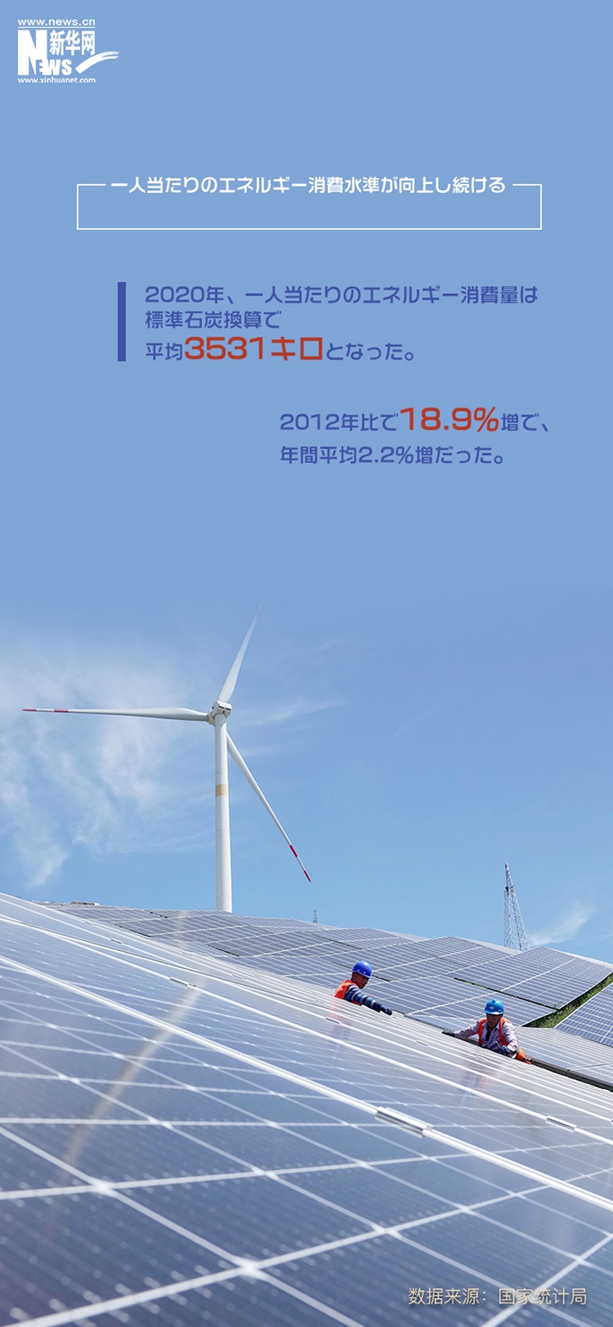 一人當(dāng)たりのエネルギー消費(fèi)水準(zhǔn)が向上し続けている。2020年、中國(guó)人の一人當(dāng)たりのエネルギー消費(fèi)量は標(biāo)準(zhǔn)石炭換算で平均3531キロとなり、2012年比で18.9%増で、年間平均2.2%増だった。そして民生用エネルギー消費(fèi)が力強(qiáng)く保障されている。2020年、中國(guó)の生活におけるエネルギー消費(fèi)は標(biāo)準(zhǔn)石炭換算で一人當(dāng)たり456キロで、2012年比で46.2%増で、年間平均4.9%増だった。生活における電力消費(fèi)量は年間平均7.3%増で、天然ガス消費(fèi)量は年間平均8.1%増だった。