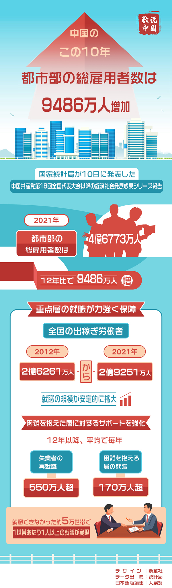 國家統(tǒng)計局が10日に発表した中國共産黨第18回全國代表大會以降の経済社會発展成果シリーズ報告によると、2021年に中國都市部の総雇用者數(shù)は4億6773萬人に達(dá)し、12年比で9486萬人増加したという。新華社が伝えた。
