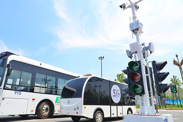 2019年6月15日、浙江省湖州市徳清県地理情報タウンで、體験者を乗せ、自動運(yùn)転テスト道路を走る5G自動運(yùn)転路線バス。(撮影?謝尚國)
