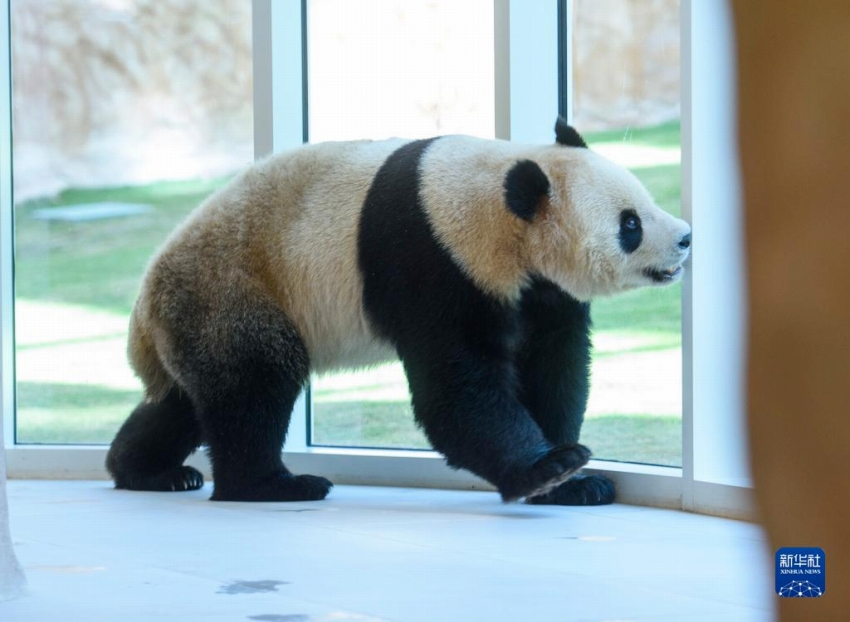カタールの首都ドーハにあるアルホールパンダ館の中を歩き回るジャイアントパンダ(10月19日撮影)。