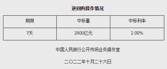 納稅時期のピークや國債の発行?支払いなどの要因による影響のリスクをヘッジし、月末の流動性の安定を維持するため、中國人民銀行(中央銀行)は2022年10月26日に金利入札方式によって2800億元(1元は約20.4円)のリバースレポを?qū)g施した。期間は7日間、金利は2.00%。(編集KS)