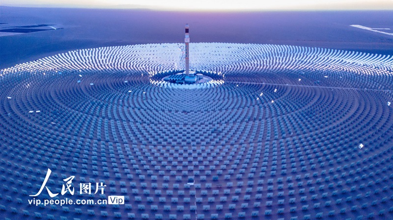 (中)甘肅敦煌光電產(chǎn)業(yè)園內(nèi),萬余面定日鏡以同心圓狀圍繞著260米高的吸熱塔。