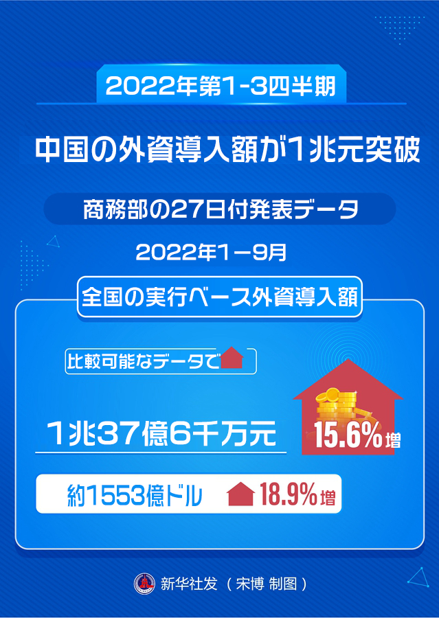 商務(wù)部(省)が27日に発表したデータによると、2022年1-9月には、全國の実行ベース外資導(dǎo)入額が比較可能なデータで前年同期比15.6%増の1兆37億6千萬元(1元は約20.2円)となり、米ドル換算では同18.9%増の1553億ドル(1ドルは約146.2円)だった。新華社が伝えた。