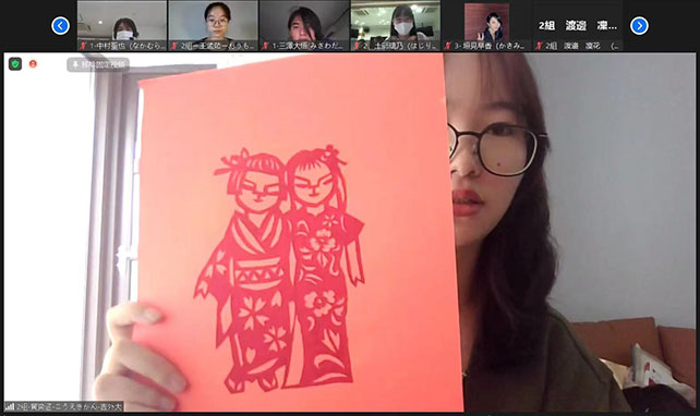 同イベントでは、吉林省と鳥取県の學(xué)生代表がそれぞれの都市を紹介。吉林省の森林公園?浄月潭や六鼎山、鳥取県の砂丘や名峰?大山など、その美しい景色が學(xué)生らを魅了したほか、吉林省の特産品であるキムチや冷麺、鳥取県のカニや二十世紀(jì)梨といったグルメも紹介された。また、吉林外國(guó)語大學(xué)の學(xué)生が中國(guó)の切り絵細(xì)工を披露して、その魅力を伝えた。學(xué)生の黃奕涵さんは、チャイナドレスを著た中國(guó)の子供と著物を著た日本の子供が仲良く手をつないでいる切り絵細(xì)工作品を披露し、中日両國(guó)の友好が永く続くことを願(yuàn)う思いを伝えた。