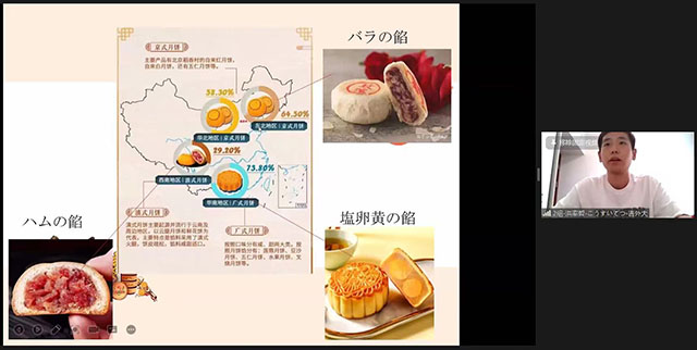 また、洪率哲さんは伝統(tǒng)的な祝祭日の中秋節(jié)(舊暦8月15日)を紹介。月餅を自作する動(dòng)畫を通して、「但だ願(yuàn)はくは人長(zhǎng)久に、千里嬋娟を共にせんことを(ただ願(yuàn)う、人々が健康に過ごすことを、千里離れてもこの美しい月を見て共に過ごしていることを)」と詩に詠まれた中國(guó)の文化の奧深さを伝えた。一方、鳥取大學(xué)の學(xué)生は折り紙の実演、鳥取環(huán)境大學(xué)の學(xué)生はけん玉の実演としゃんしゃん傘踴りの紹介を行った。學(xué)生らはバラエティーに富んだ交流を通して、理解を深め合った。