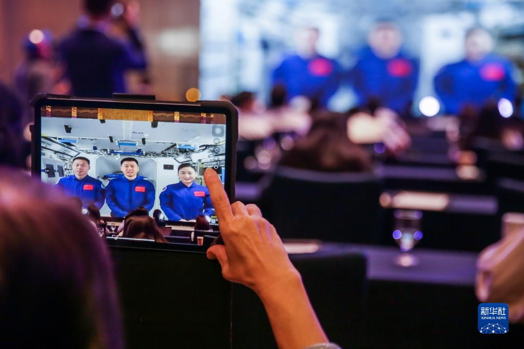 參加者からのさまざまな質(zhì)問に対して、乗組員の陳冬飛行士、劉洋飛行士、蔡旭哲飛行士は一つ一つ丁寧に答えるとともに、宇宙ステーションでの作業(yè)?生活狀況を紹介した。中國の宇宙ステーションには給水器と溫風循環(huán)加熱裝置があり、お湯を飲み、新鮮で熱々の食べ物を食べることができる。宇宙では90分毎に日出と日沒を見ることができるが、宇宙飛行士は毎晩7時間睡眠する。