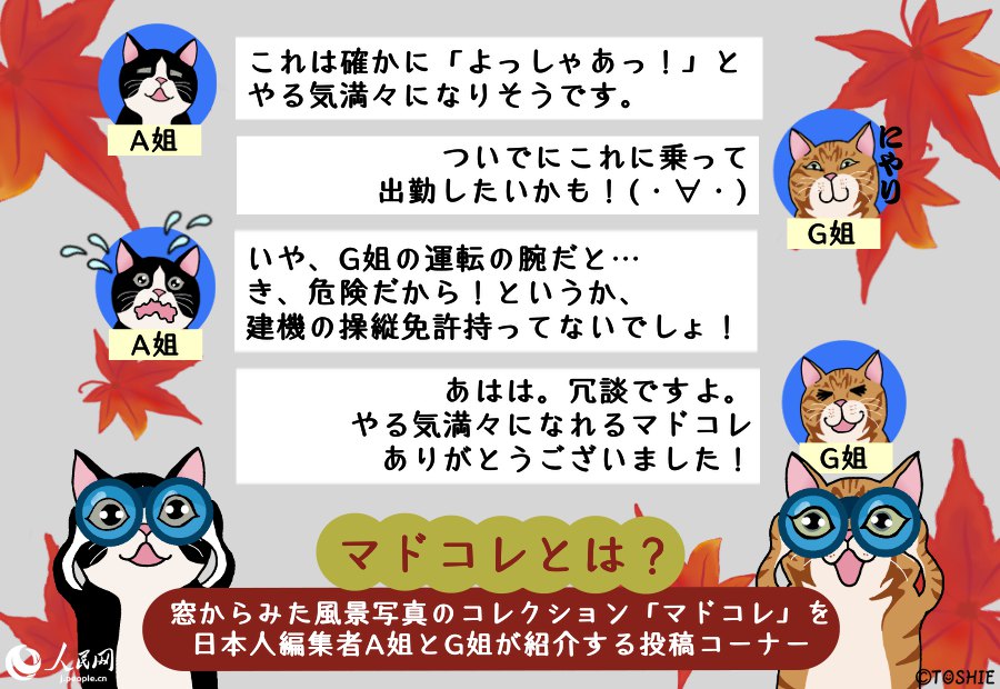 人民網(wǎng)では、ウチのオフィスの窓からはこんな風(fēng)景またはこんなモノが見(jiàn)えるという自慢をしていただく「マドコレ(窓から見(jiàn)た風(fēng)景コレクション)」を毎週火曜日に掲載中!オフィスの窓からの眺めでもよし、お仕事中の窓からの眺めでもよし、とにかく窓から眺めた様子を?qū)懁筏繉?xiě)真とそれにまつわるエピソードをご投稿ください!