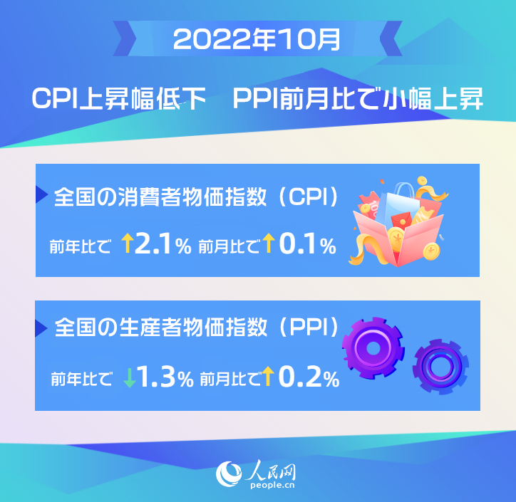 國家統(tǒng)計局が9日に発表したデータによると、2022年10月には、全國の消費者物価指數(shù)(CPI)が前年比で2.1%、前月比で0.1%上昇した。全國の生産者物価指數(shù)(PPI)は前年比で1.3%低下、前月比で0.2%上昇となった。