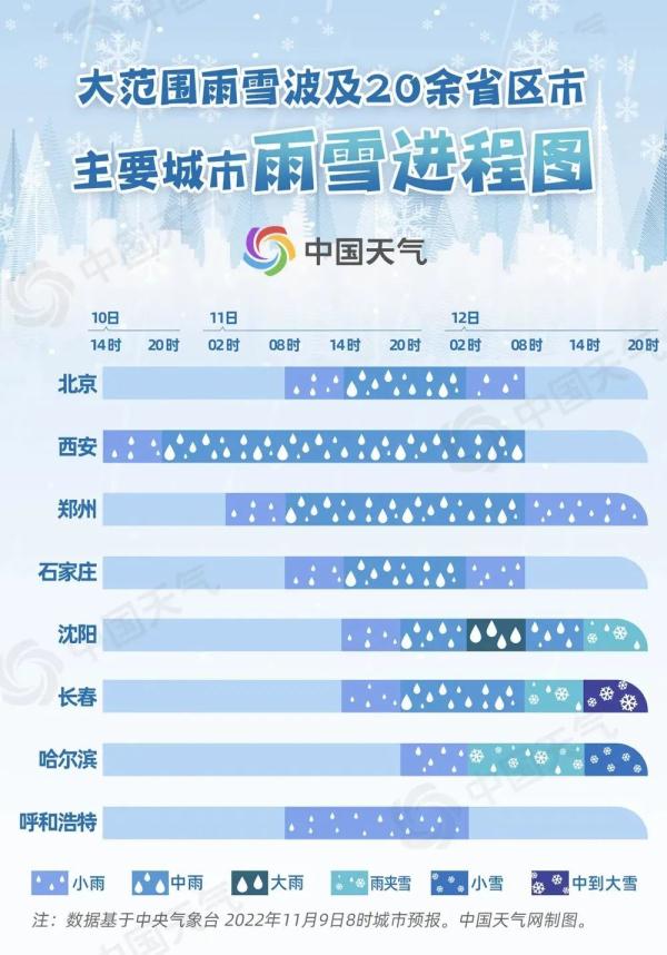 強(qiáng)い寒気の影響で、中國北方エリアの広い範(fàn)囲で今月10日から12日にかけて、今シーズンの冬初めてまとまった雨または雪が降ることになりそうだ。雨や雪の影響は約20の省?區(qū)?市に及び、華北エリアや東北エリアといった地域では、強(qiáng)い雨が降り、局地的には大雨となる所も出てきそうだ。一部の地域では雪が舞い、長春や哈爾浜(ハルビン)などでは今シーズンの初雪となる可能性もある。表にまとめた主な8都市で雨や雪が降る時間帯を見て、自分の住む地域の天気を確認(rèn)しておこう。中國天気網(wǎng)が報じた。