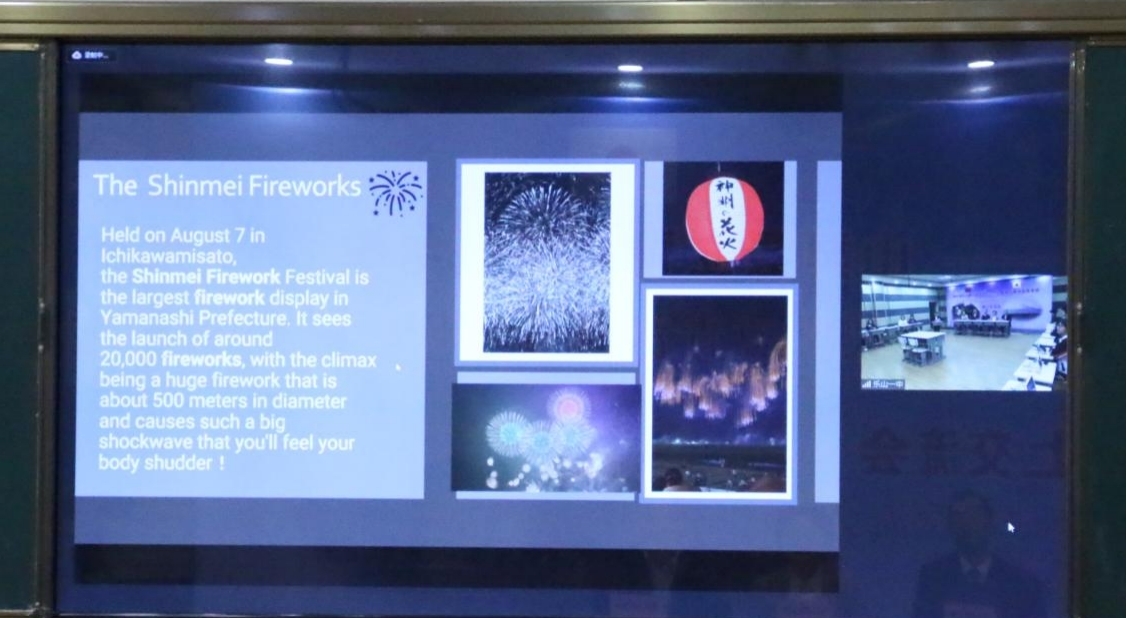イベントの中で、楽山一中の生徒は多彩なクラブ活動(dòng)、メンタルヘルスデーのイベント、さまざまなテーマをめぐる學(xué)級(jí)會(huì)など學(xué)校生活の様子を紹介?共有するとともに、楽山大仏、峨眉山、沐川竹海などの豊富な観光資源、楽山名物の翹腳牛肉(牛ホルモン料理)、甜皮鴨(鴨肉の甘だれ焼き)、麻辣燙(マーラータン、ピリ辛風(fēng)味の煮込み料理)などの地元の軽食、五通橋のドラゴンボートレース、夾江の木版年畫、峨眉山の手摘み手炒りの手工茶、蛾眉武術(shù)などの民俗文化を紹介した。青洲高校の生徒は自分たちの學(xué)校の文化や學(xué)校での生活、山梨県の風(fēng)土?人情や伝統(tǒng)的な民俗文化などを紹介した。