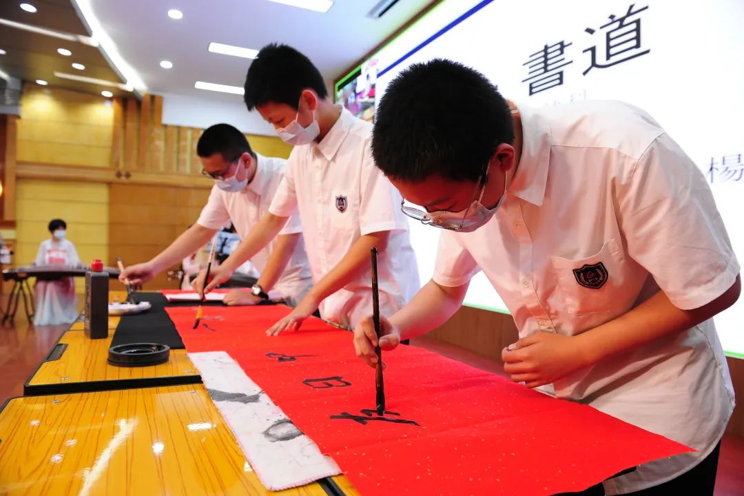 さらに、中學(xué)2年生の日本語を?qū)Wぶ生徒が伝統(tǒng)楽器の演奏をし、その場で書道作品を書き上げて參加者に披露した。古箏と琵琶の抑揚(yáng)に富んだメロディが流れる中、書道チームの男子生徒3人が墨で勢いよく気持ちを表現(xiàn)し、隷書、楷書、行書の書體で「中日友好、源遠(yuǎn)流長、松柏長青、共築未來!(中日の友好は、長い歴史がある、いつまでも青々とした松や柏のような青春のパワーで、共に未來を築こう!)」としたため、日本の生徒に向けて日本語で書道作品の內(nèi)容を説明し、中日の友好を願う気持ちを伝えた。また生徒たちは日本語で長野市の生徒たちに伝統(tǒng)楽器の歴史と書道の各書體の由來や特徴を説明し、中華文化の獨(dú)特な魅力をより深く伝えた。