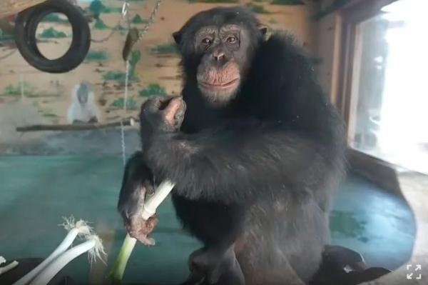 郷に入っては郷に従え?済南野生動物園のチンパンジー、山東産ネギを食す