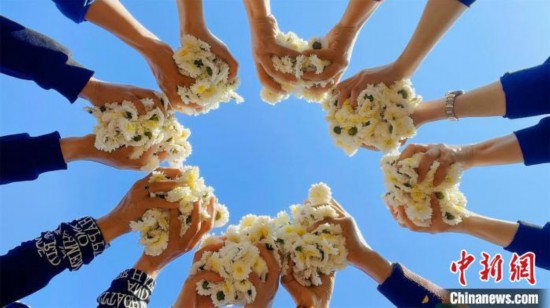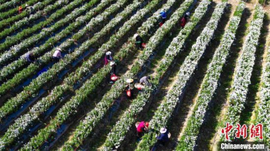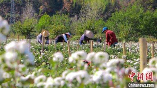 菊の花を摘む村の村民(撮影?鮑鋒)。
