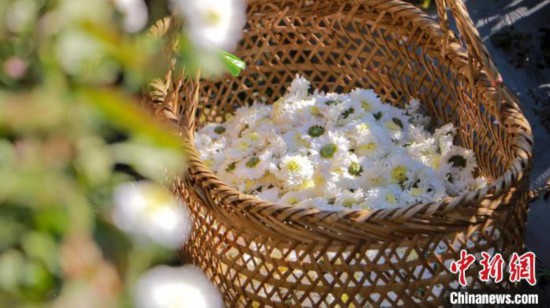 摘んだばかりの菊の花が入った竹のかご(撮影?鮑鋒)。